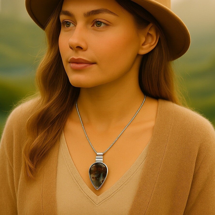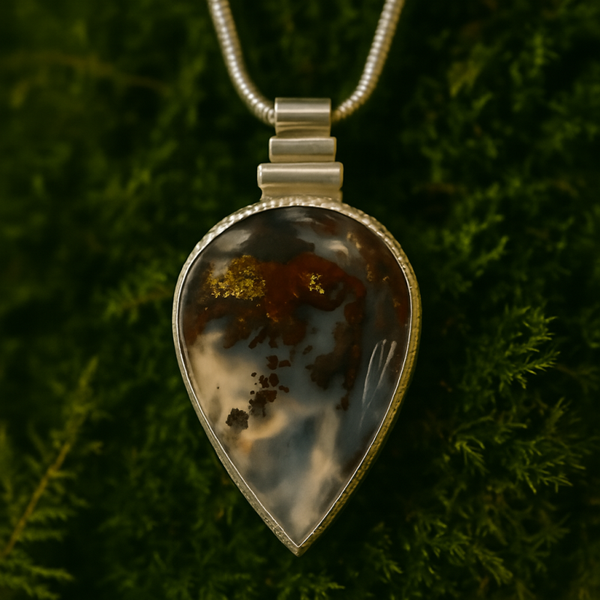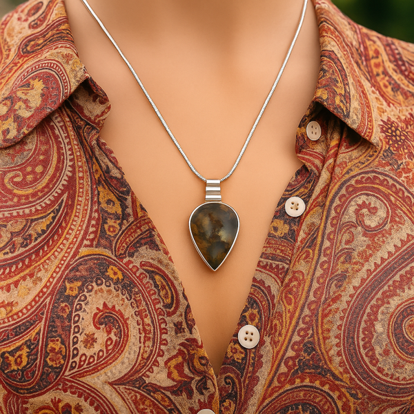 Als een verstilde bosvijver waarin het licht danst op de bladeren – zo oogt Elowen. Deze zilveren hanger omlijst een bijzondere mosagaat, waarvan de insluitsels doen denken aan mos, takjes of oude bomen gevangen in steen. Elk detail is uniek; een miniatuurlandschap dat je altijd bij je draagt.