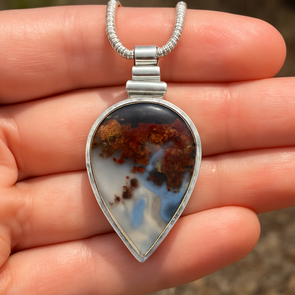 De hanger (5 x 2,5 cm) hangt aan een soepel slangen collier van 54 cm. De zilveren zetting is met de hand vervaardigd en volgt subtiel de natuurlijke lijnen van de steen.