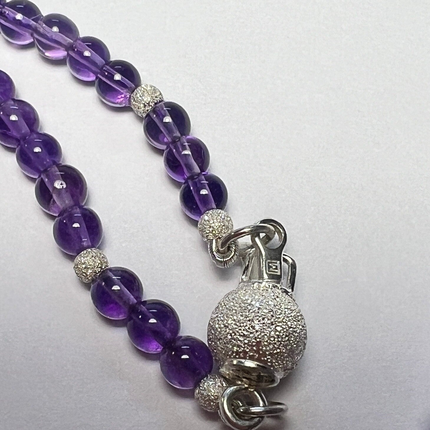 Violette Élégance is een handgeknoopt collier van 87 cm, vervaardigd uit gladgeslepen amethist en afgewerkt met verfijnde diamant-geslepen zilveren kralen. De elegante zilveren sluiting maakt de luxe uitstraling compleet.